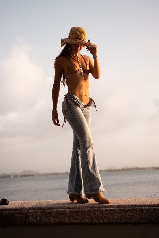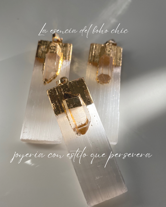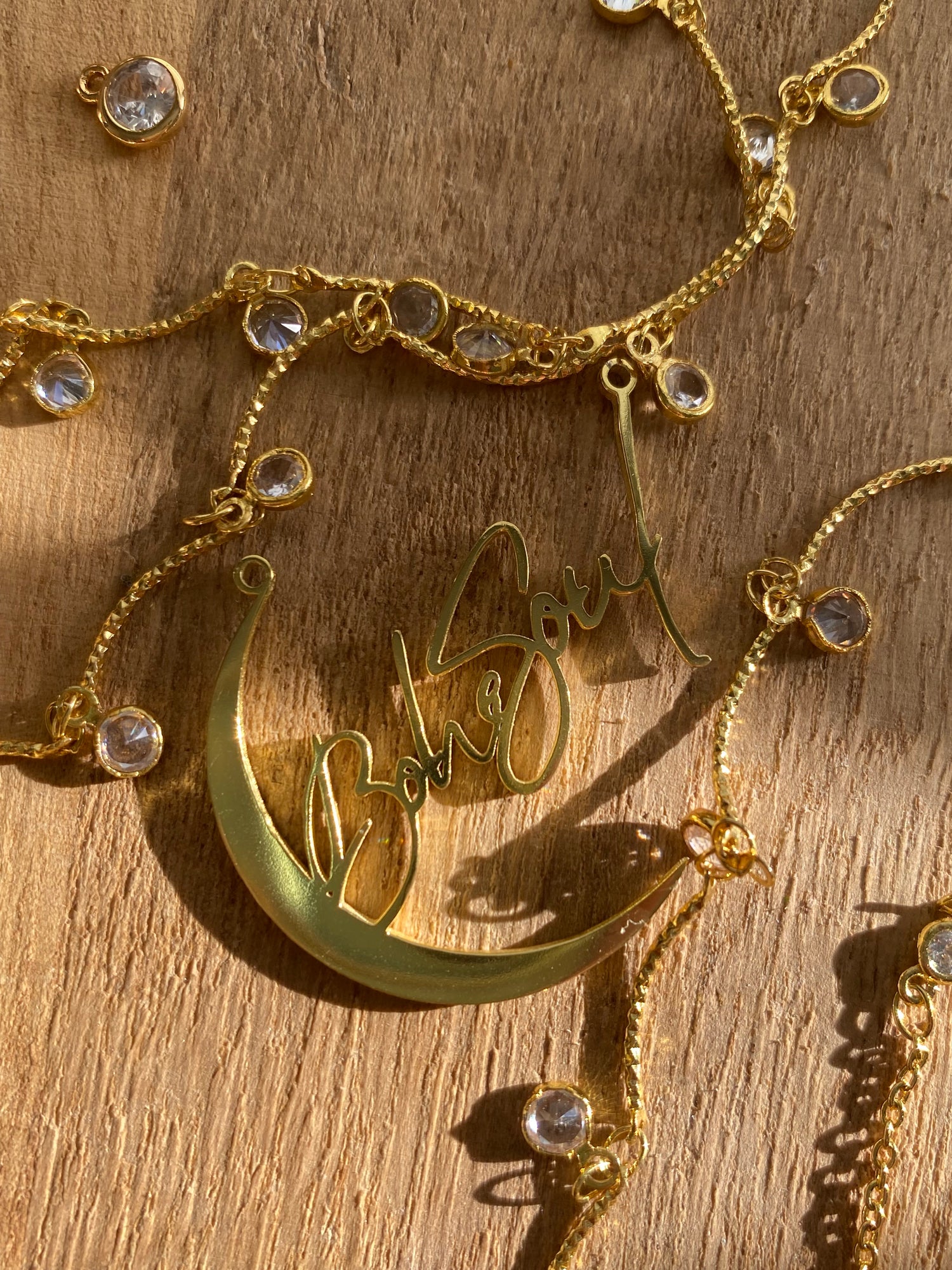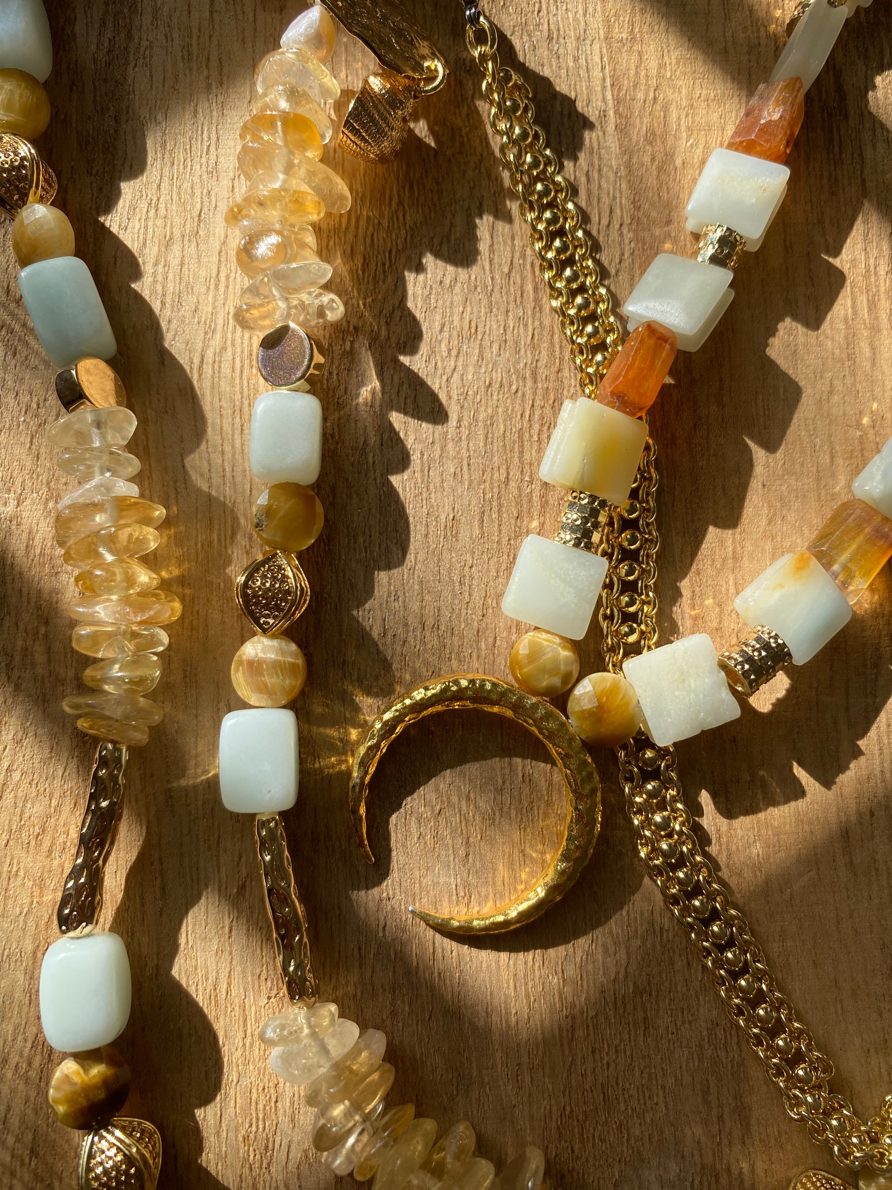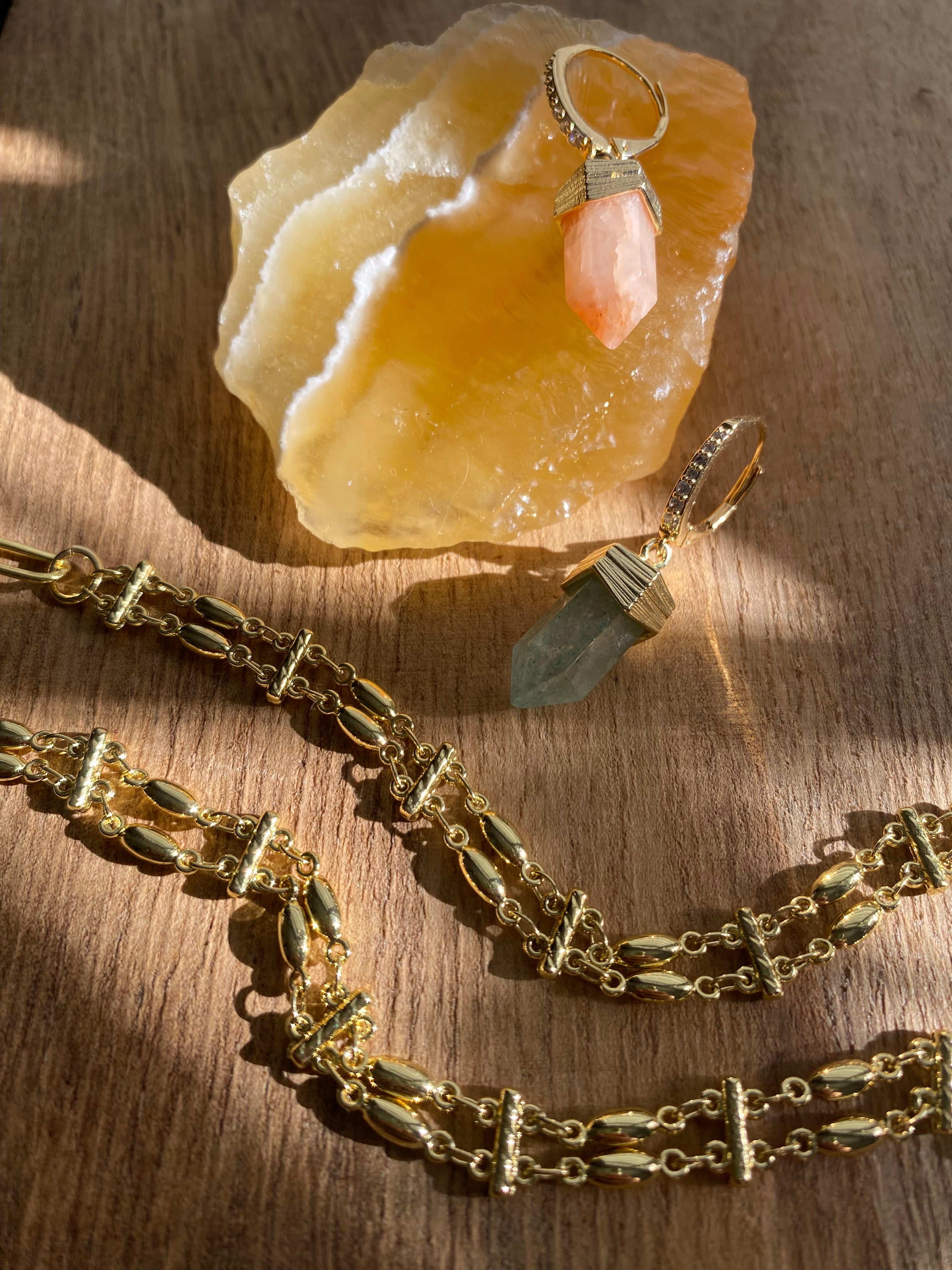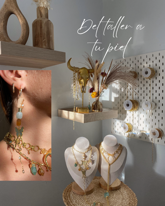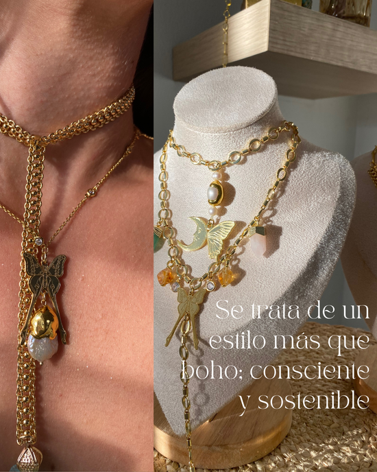 Cuando los destellos de cadenas en 18k gold filled y gemas llenas de energía se unen, nace la intención de nuestro estilo para sintonizar de forma sostenible y original, tu look boho chic.