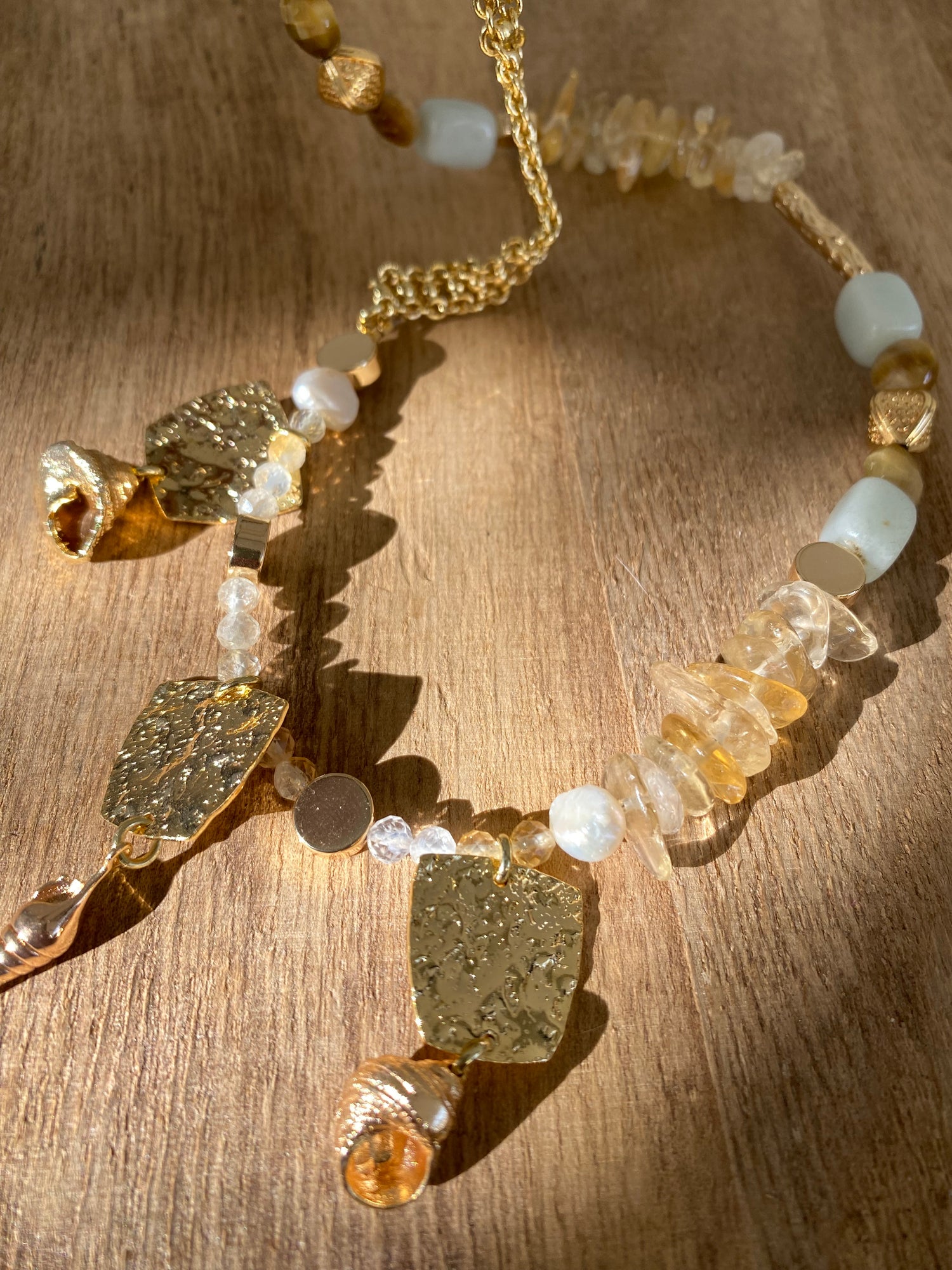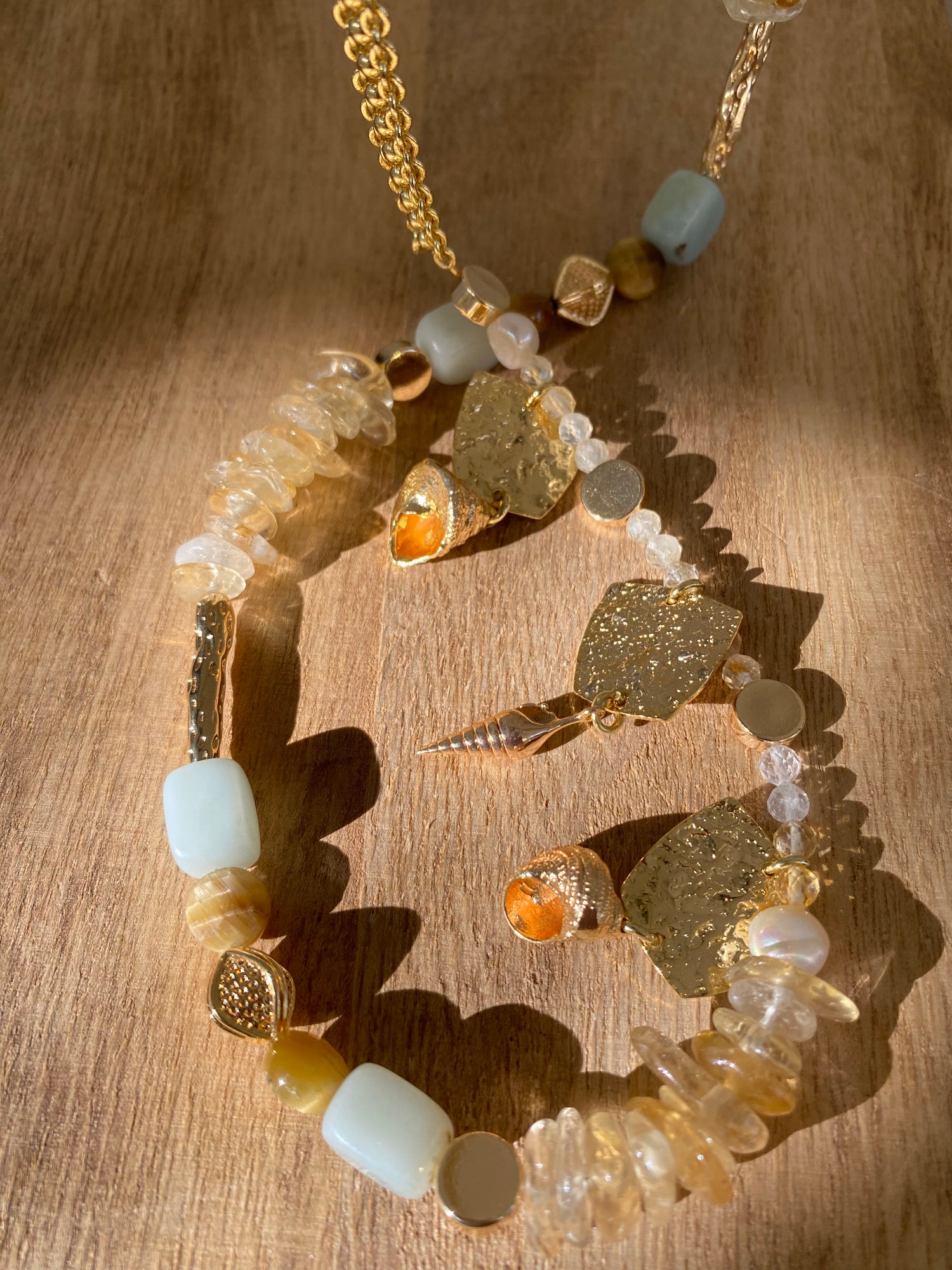 Una alta vibración que se lleva de varias formas: como un waist chain, collar, pulsera o un conjunto doble de choker. La pieza que manifiesta la vida marina de una bohemia en Puerto Rico, que con sus joyas cautiva y se eleva