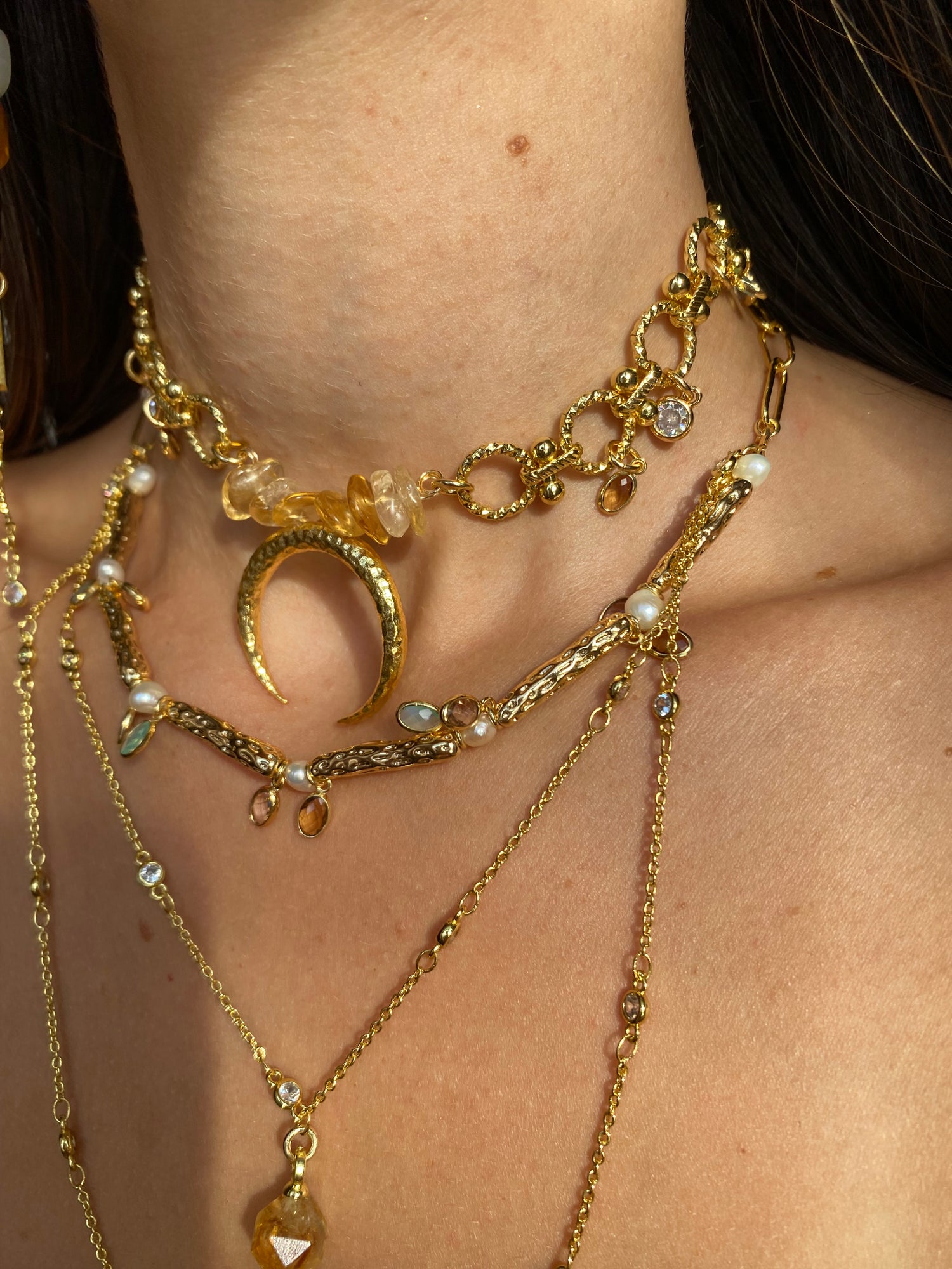 Maximalista, gitana y bohemia en una pieza de choker diseñada con vibración de Citrino y el brillo intenso del gold filled