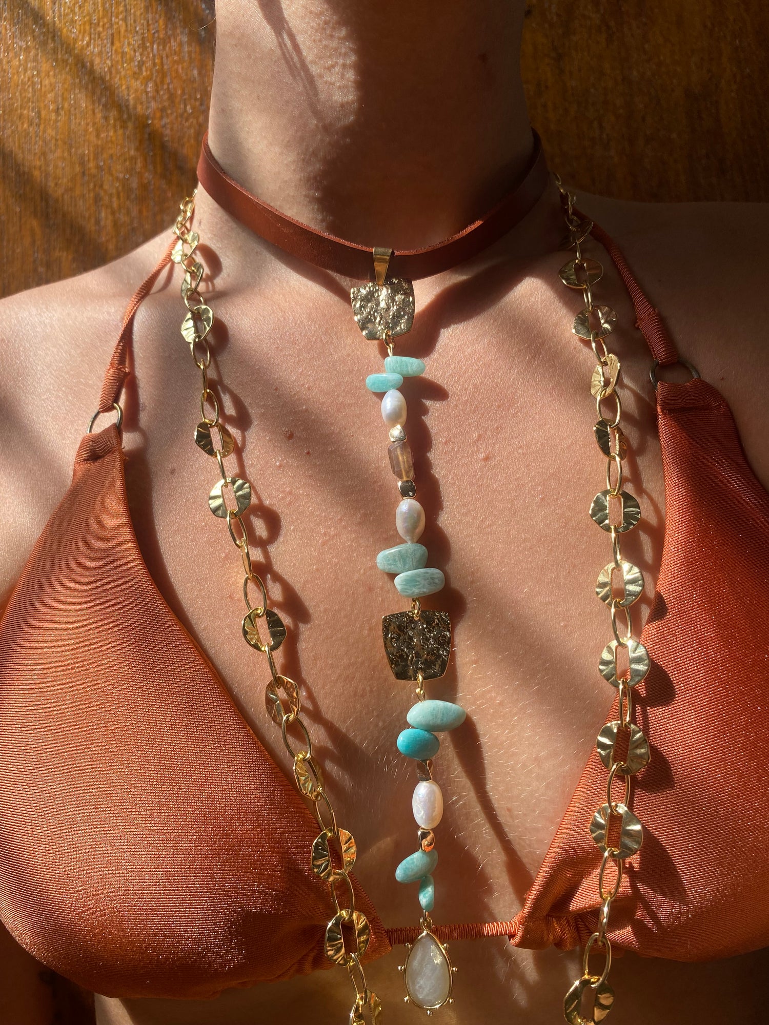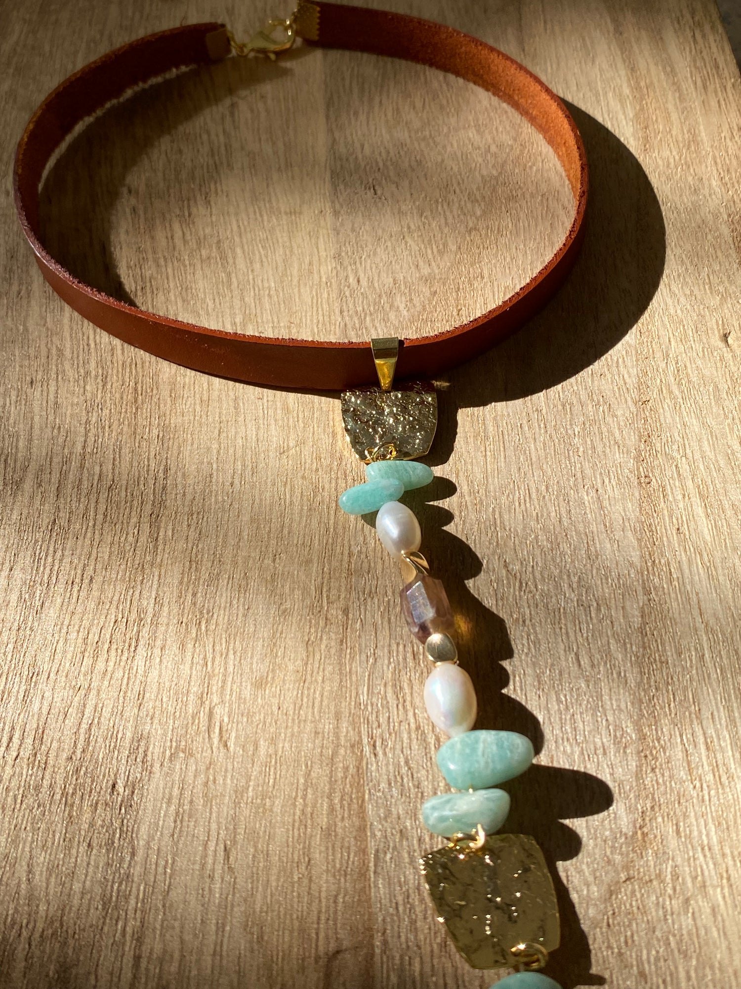 Un leather no convencional por supuesto que llevara piedras de Amazonita colgando de el con dorados vibrando entre texturas