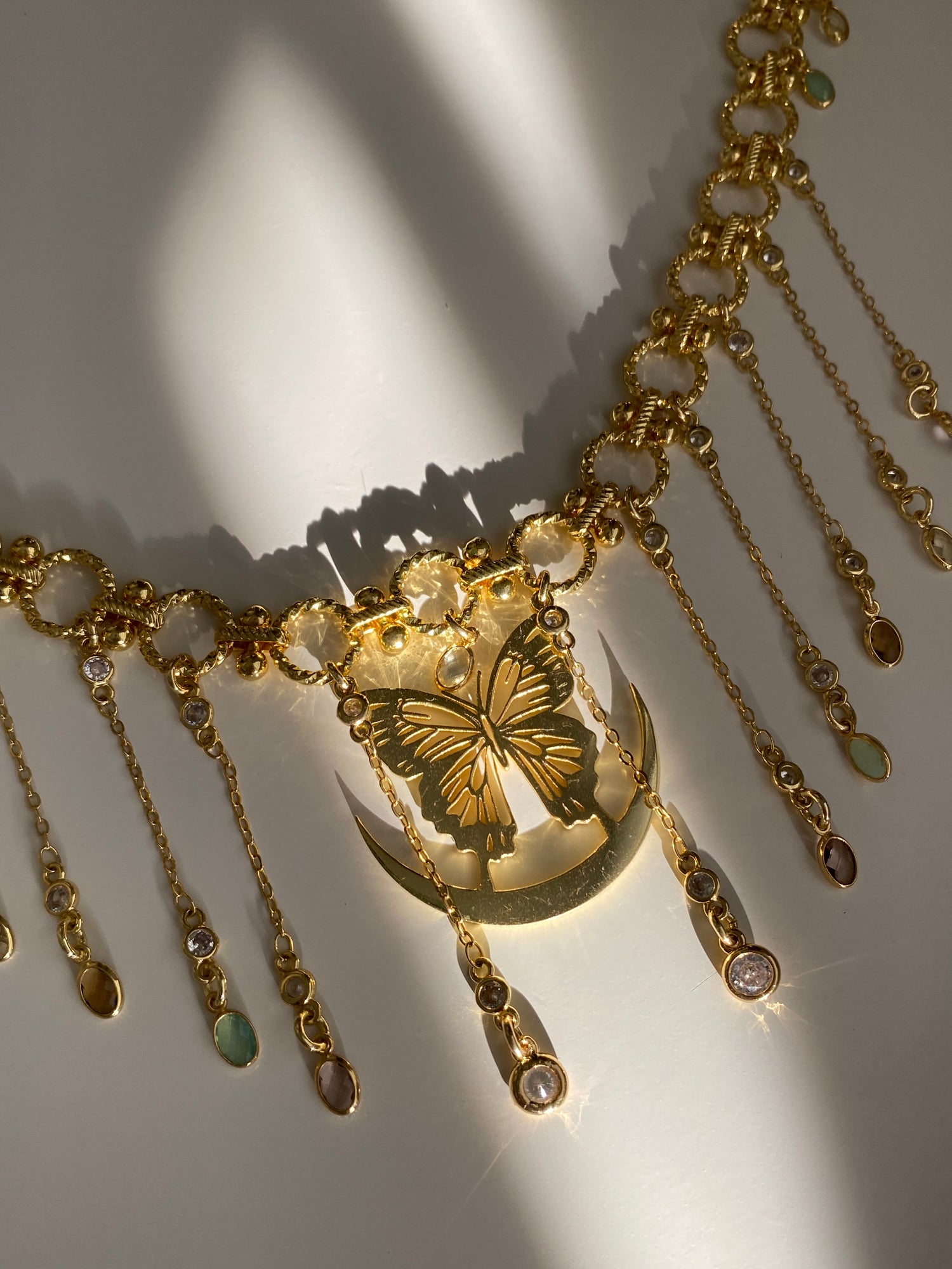 El nombre de la exclusividad. No hay otro diseño de nuestra colección de mariposas que realmente refleje su significado, que no sea esta pieza. “Metanoia Choker” explicar de que se compone, es deleitarse. Creado y dibujado entre las alas de una mariposa posada sobre una luna menguante. Hecho a mano para irradiar entre cristales y zirconias. Diseño original de Bohemy Souls