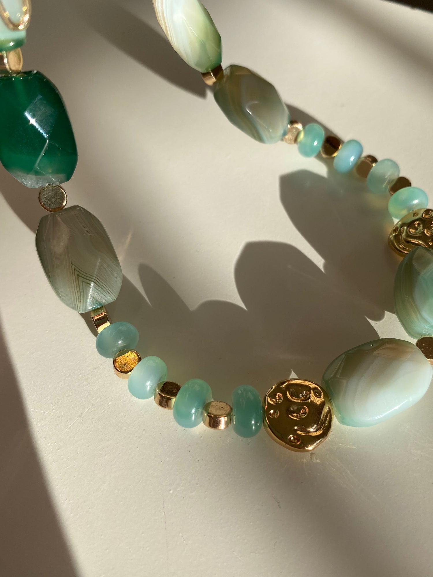 Jades que se convierten en un choker de ensueño, creado al detalle con piedras en oro laminado y la esencia de la gema de la suerte