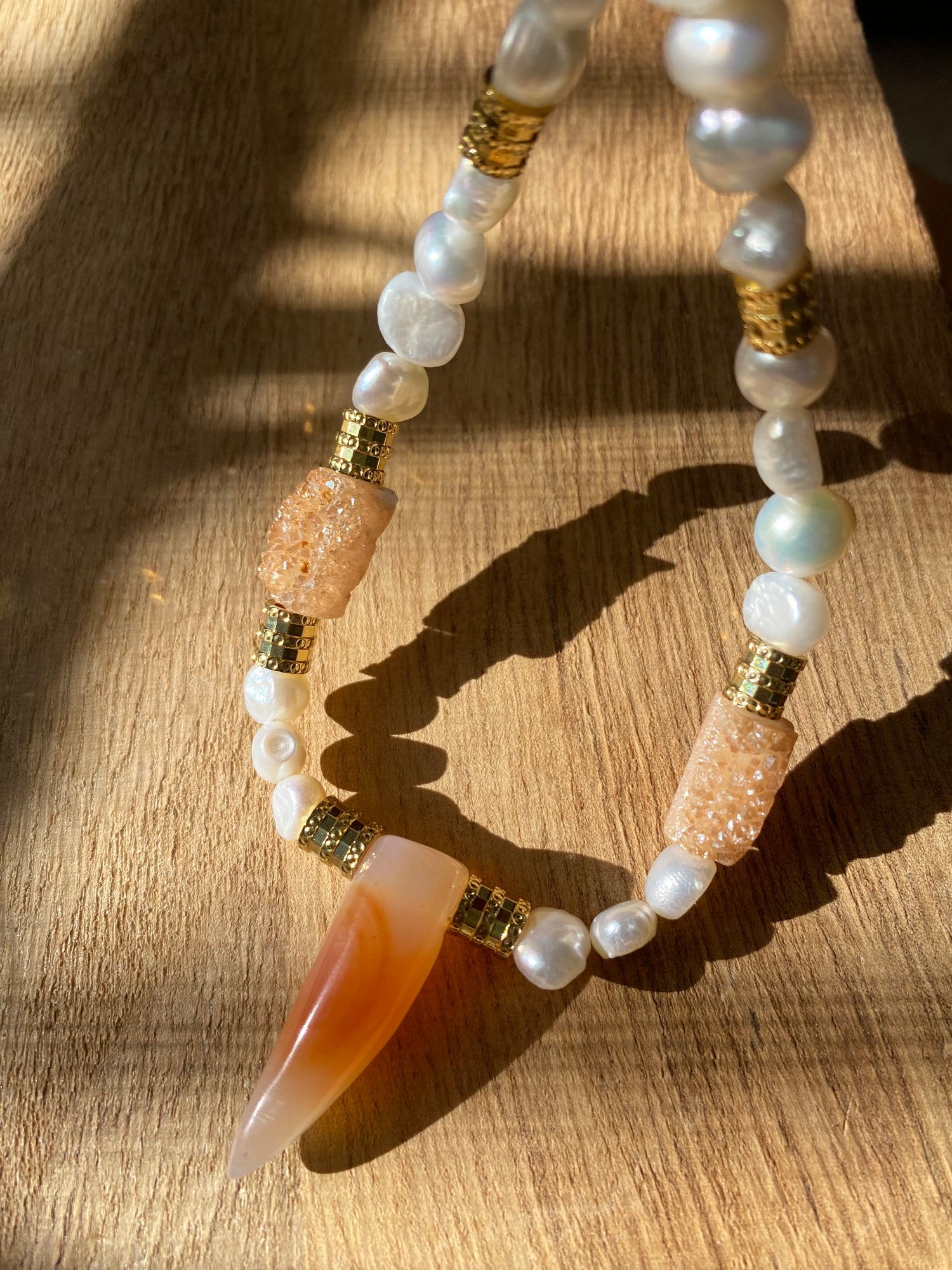 Para una bohemia las tonalidades vibrantes y todo lo natural siempre combinan bien. Las perlas de agua dulce hacen su magia en un choker que por su colgante de piedra carnelian, sabes que es una alma vintage